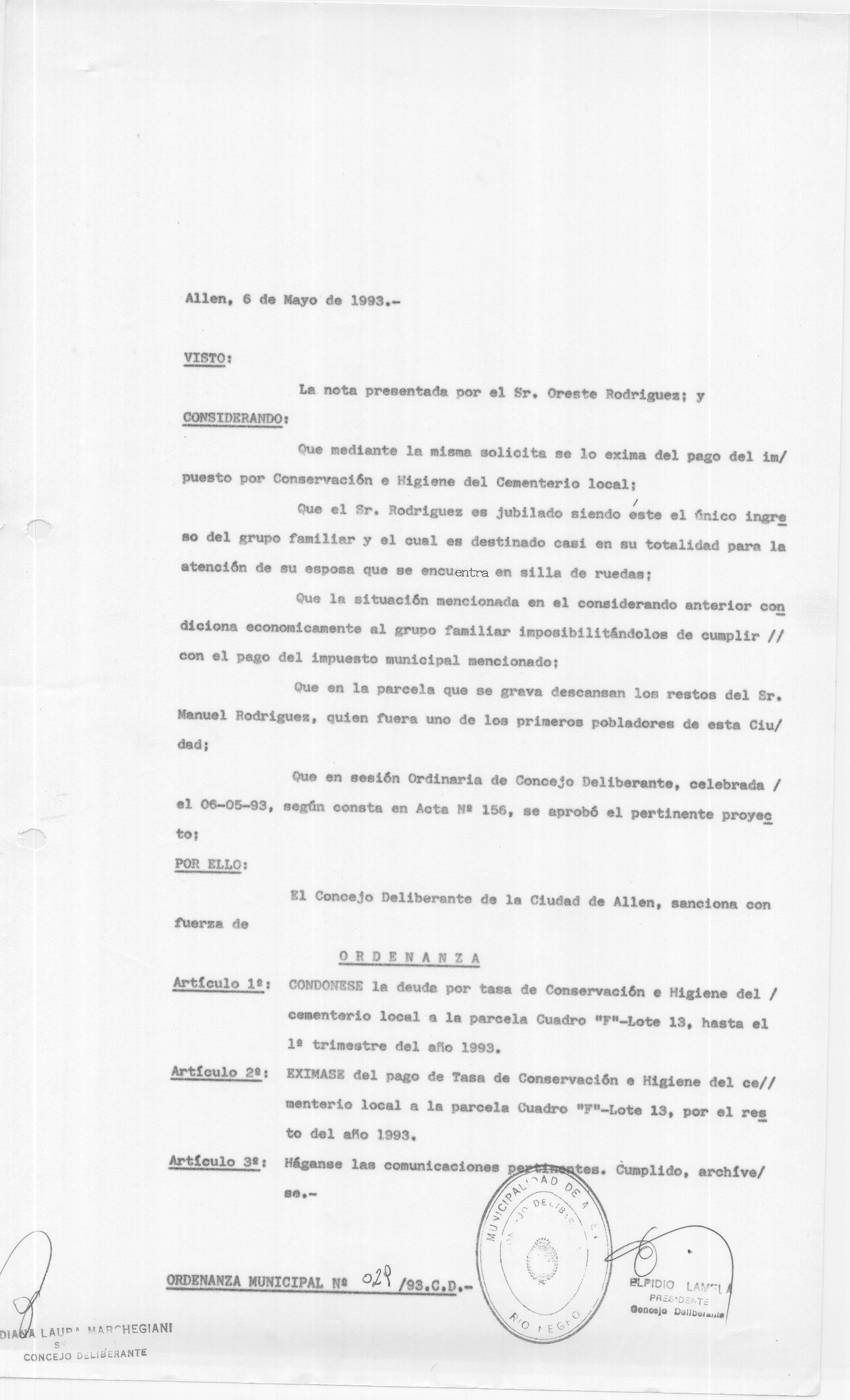 ORDENANZA N° 029/93