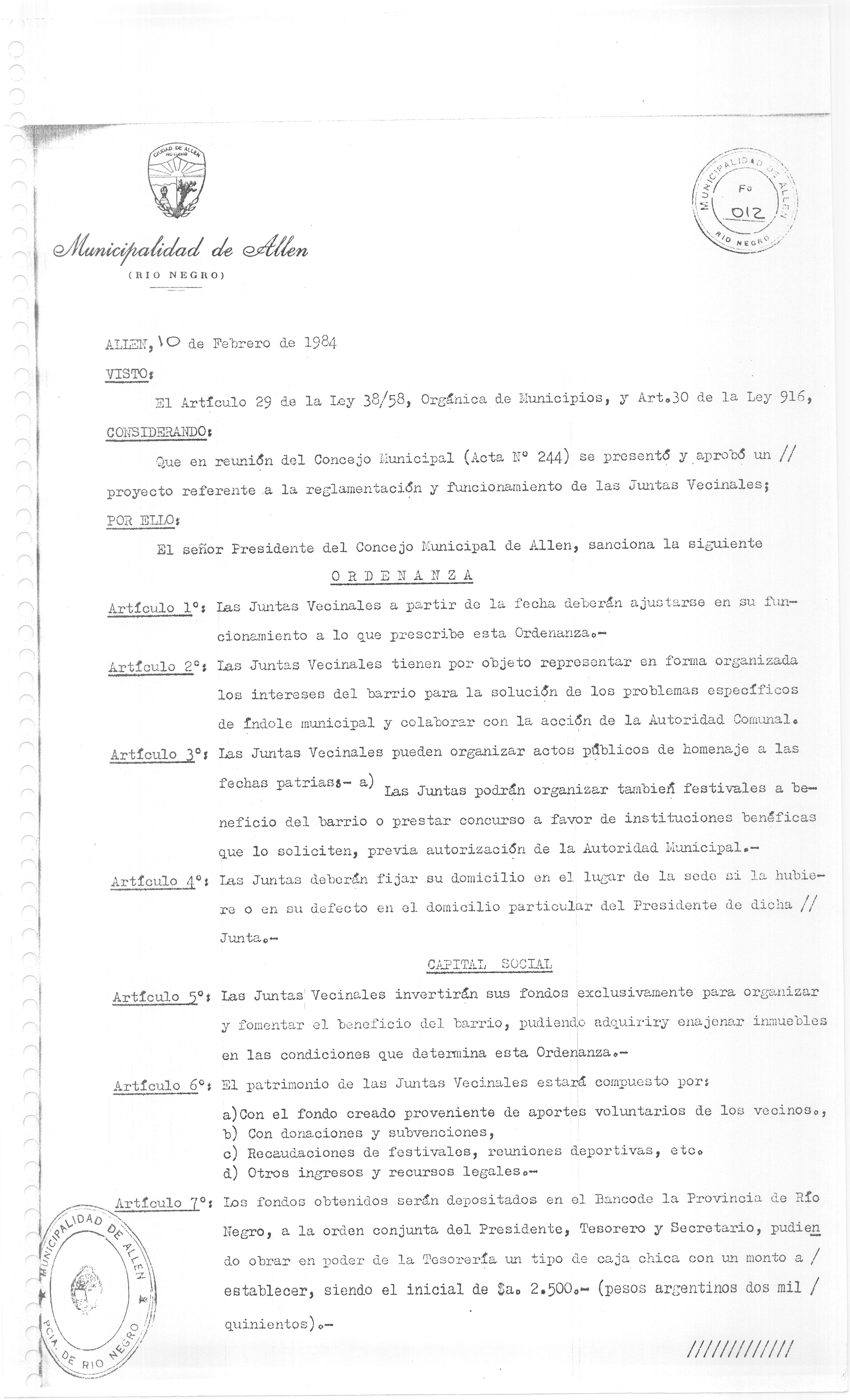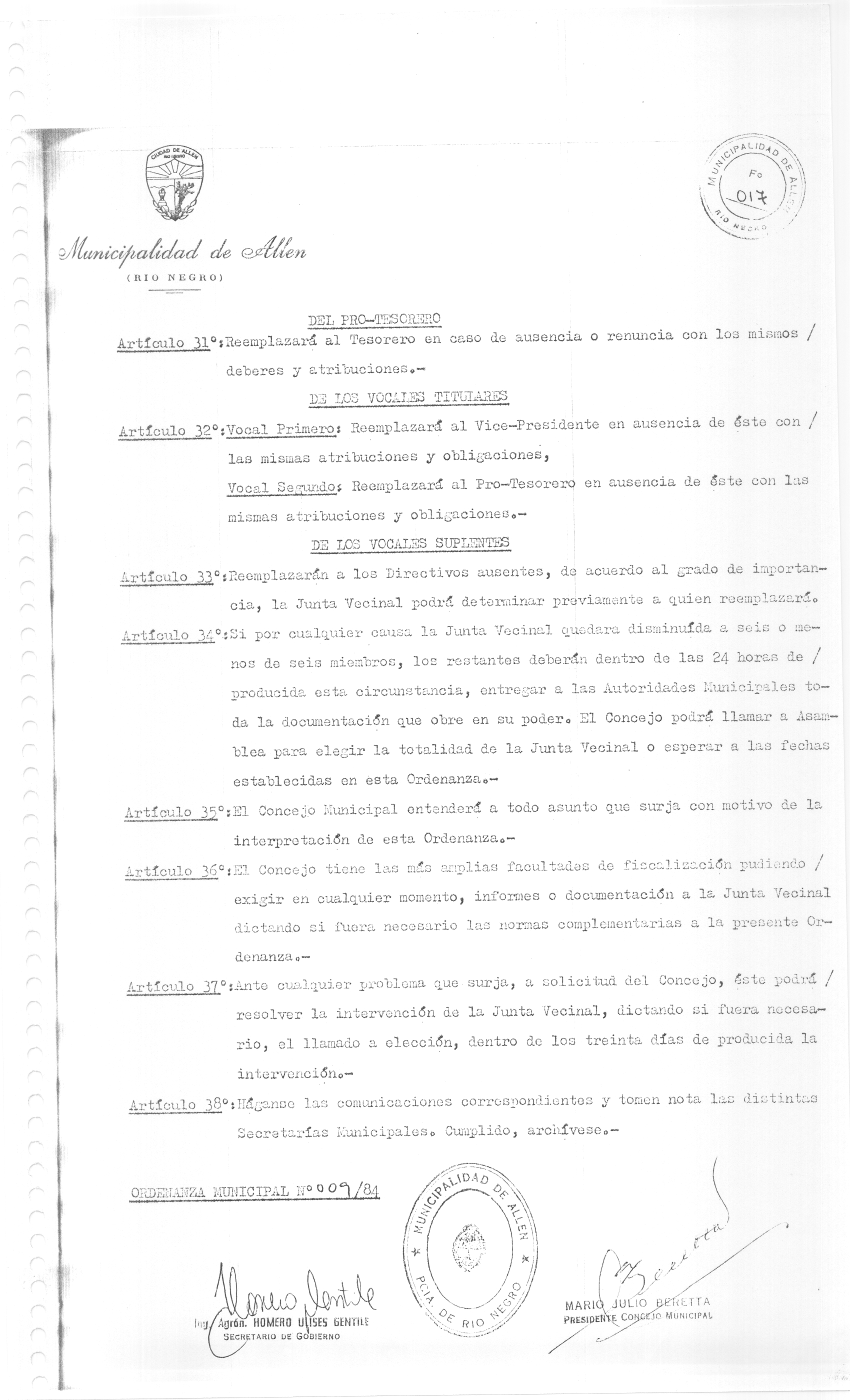 Usted seleccionó listar los archivos adjuntos de la ORDENANZA N° 009/84.