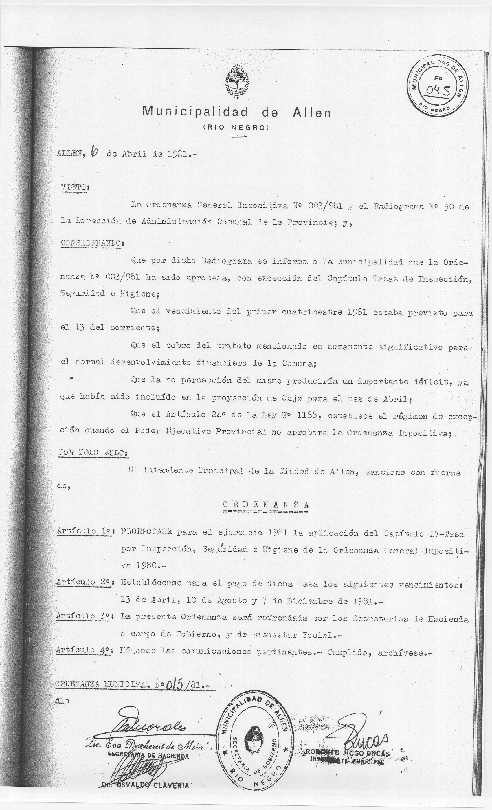 ORDENANZA N° 015/81